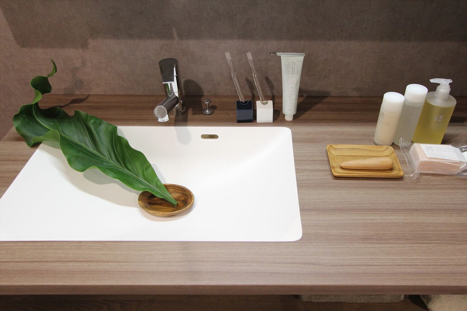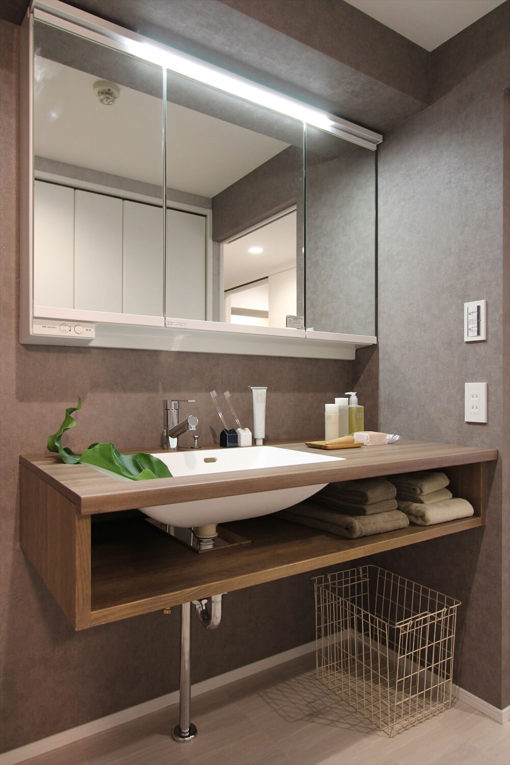 造作の洗面台は、木目のシートがオシャレなだけでなく、継ぎ目のないボウルをセレクトすることで、お手入れしやすく機能的なデザインが◎。