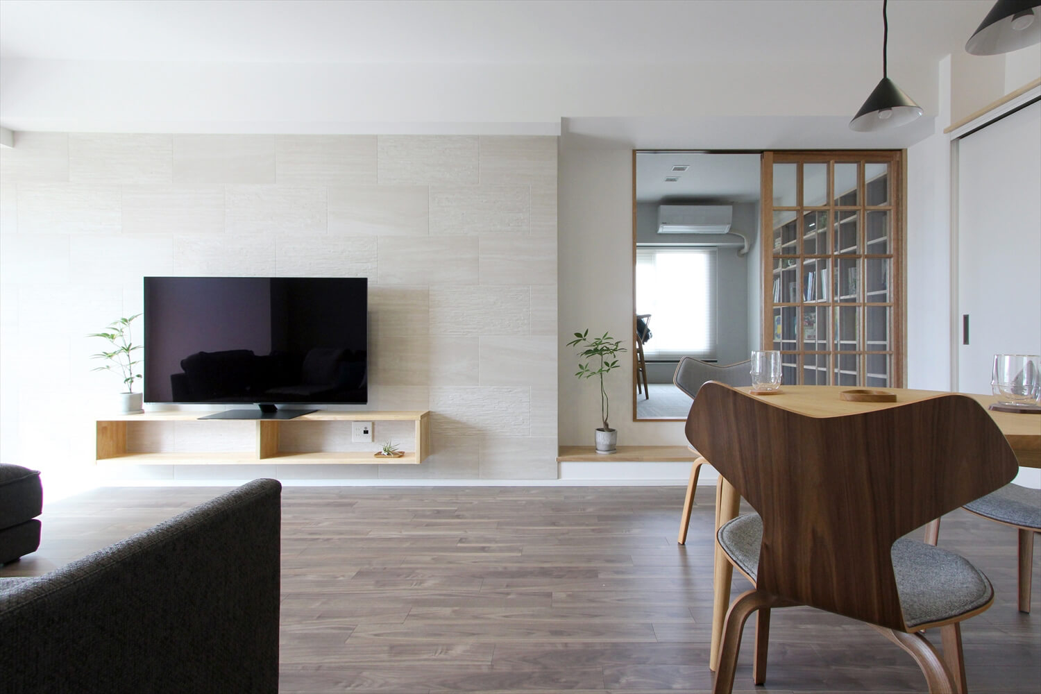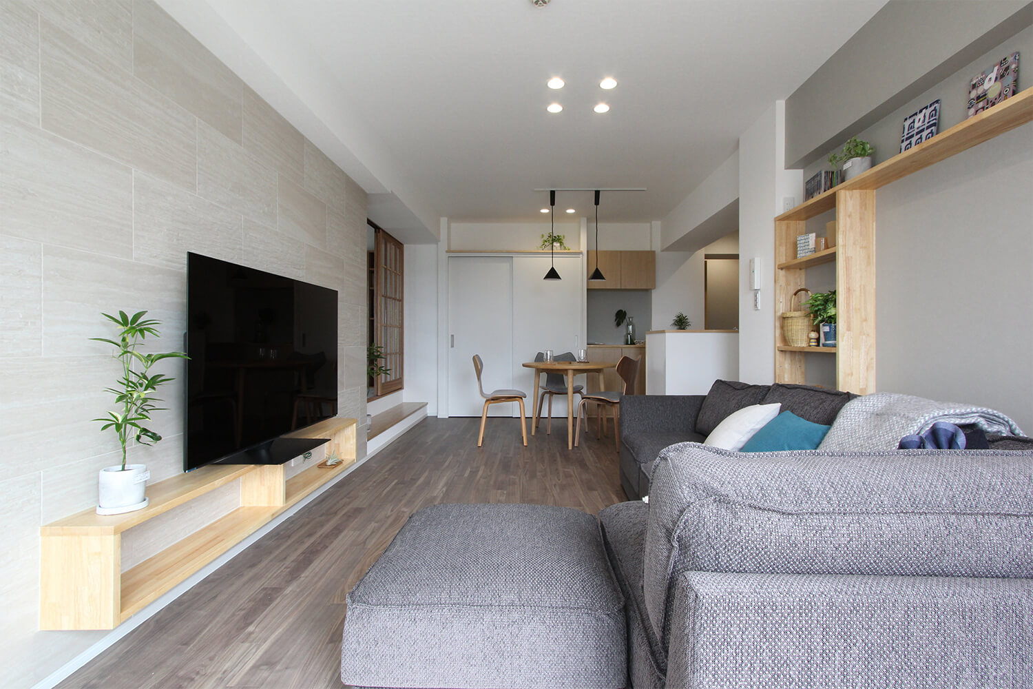 今回のリノベーションはくすんだブルーやグレーをアクセントカラーに用いたシンプルな北欧テイストとグレージュのコンビネーション。奥様こだわりの素材感のある優しいベージュカラーの石目タイルを貼ったアクセント壁。造作のテレビボードも備え、家族が集うLDKの中心となりました。