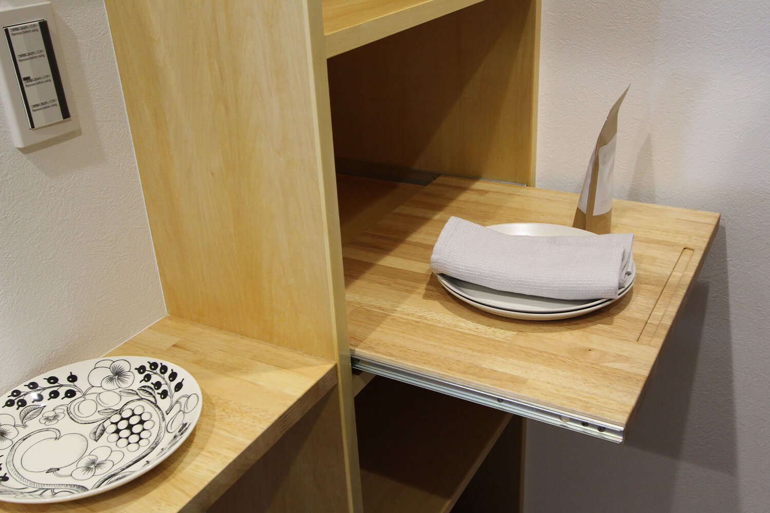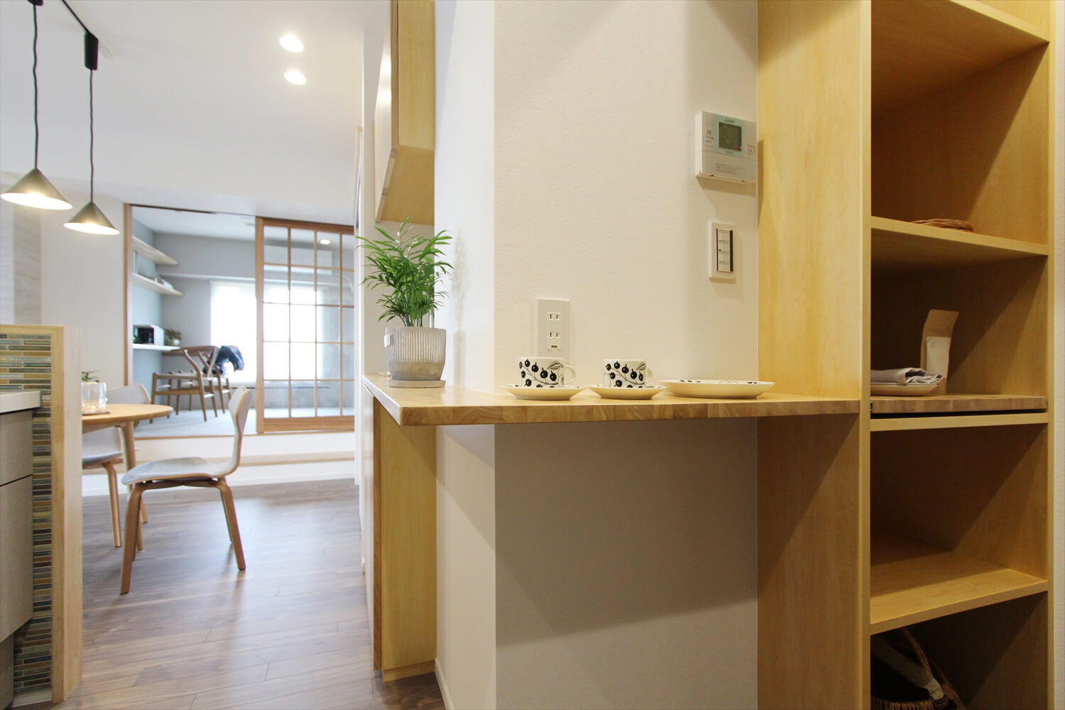 パントリーに設計したL字のカウンターは、サブの作業スペース。お弁当の盛り付けや、お手伝いをしてくれるお子さまとの共同の作業スペースとして活躍します。カウンター下はトールタイプのゴミ箱を収納できるよう空けてあります。
