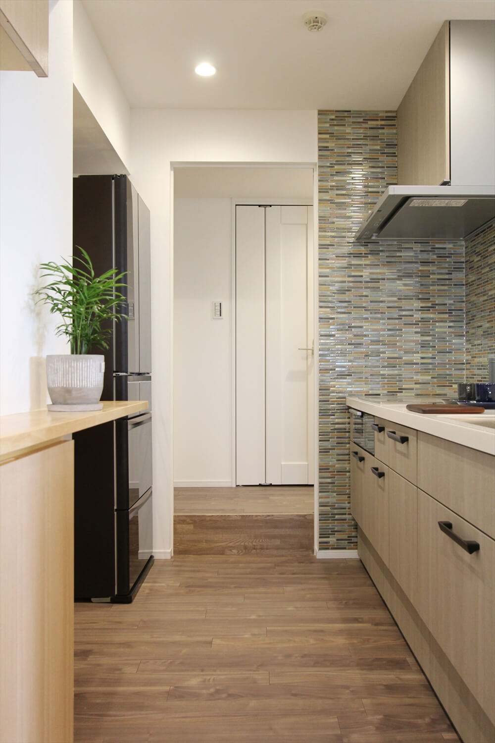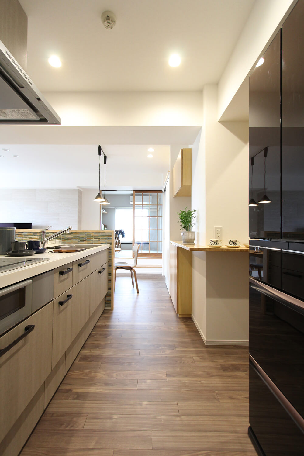 キッチンはグレージュな床とも相性バッチリの、同じトーンの木目タイプをセレクト。I型のキッチンカウンター後ろには、家事動線にこだわったカップボードや大容量の収納棚を配置。