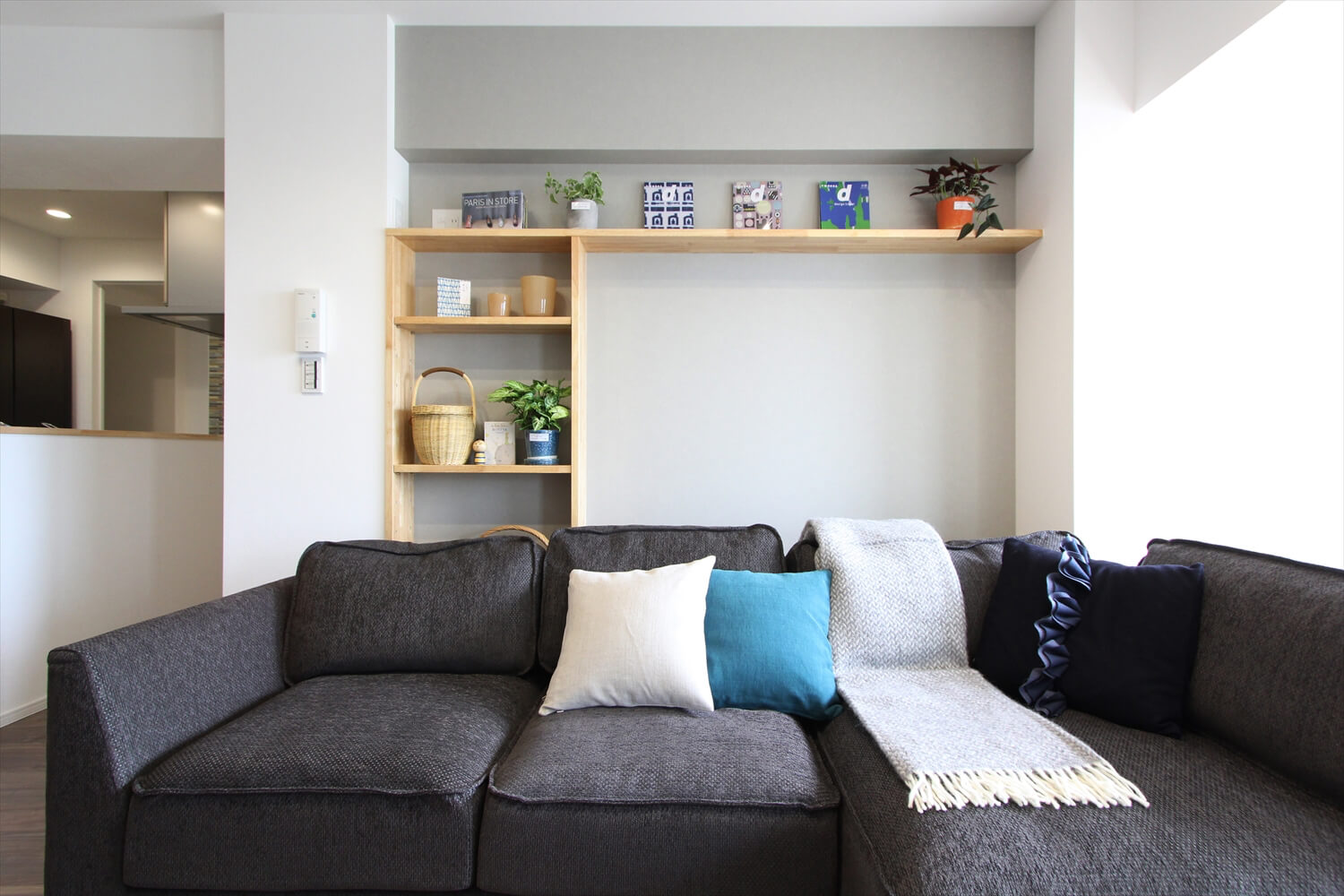 ご主人がサイズと質感にとことんこだわったダークグレーのソファ。4人家族全員をゆったりと包み込む、理想的なくつろぎ空間になりました。さらに後日、ヘッドレストも追加されました。今頃きっと、極上の座り心地を家族みんなで味わっていることでしょう。