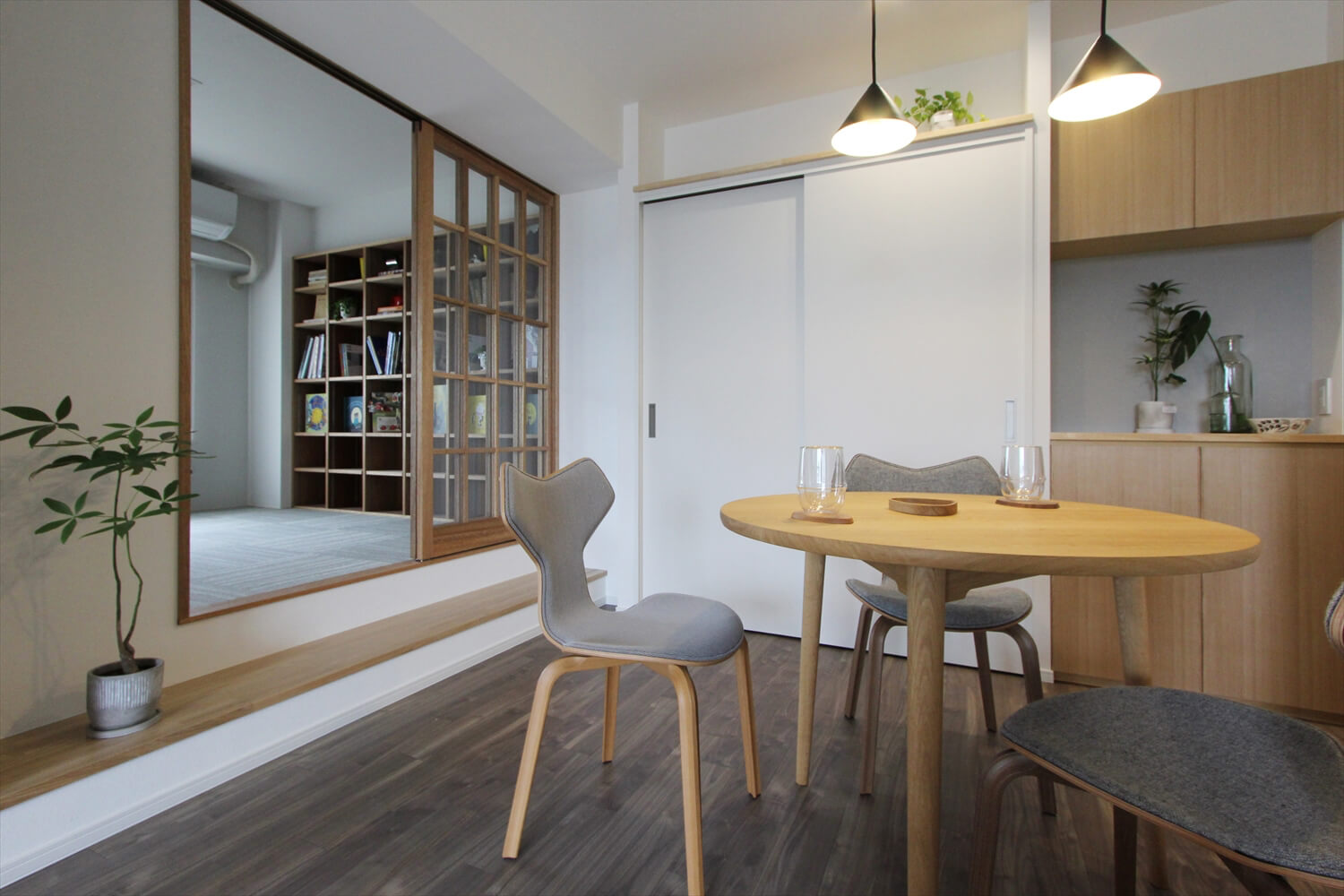 キッチンカウンターと書斎の間に位置するダイニングテーブル。コンパクトながらも家族全員が食事を楽しめるよう、ラウンドタイプのテーブルをご提案しました。