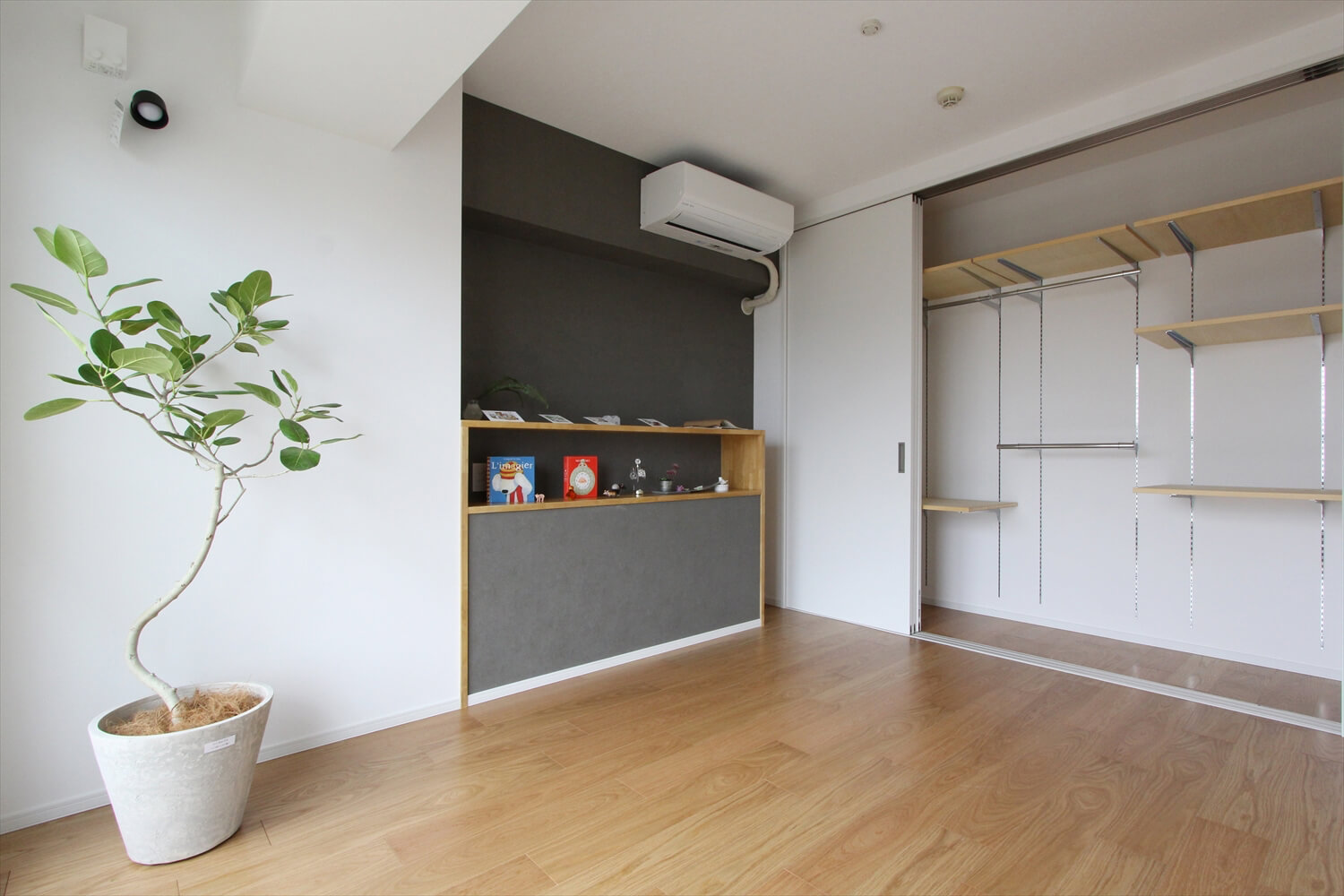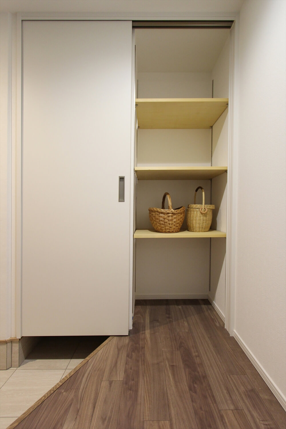 クローゼットの対面には収納を設け、左半分をシューズクローゼット、右半分は外出時に使う大ぶりなアイテムが収められるようにデザインしています。