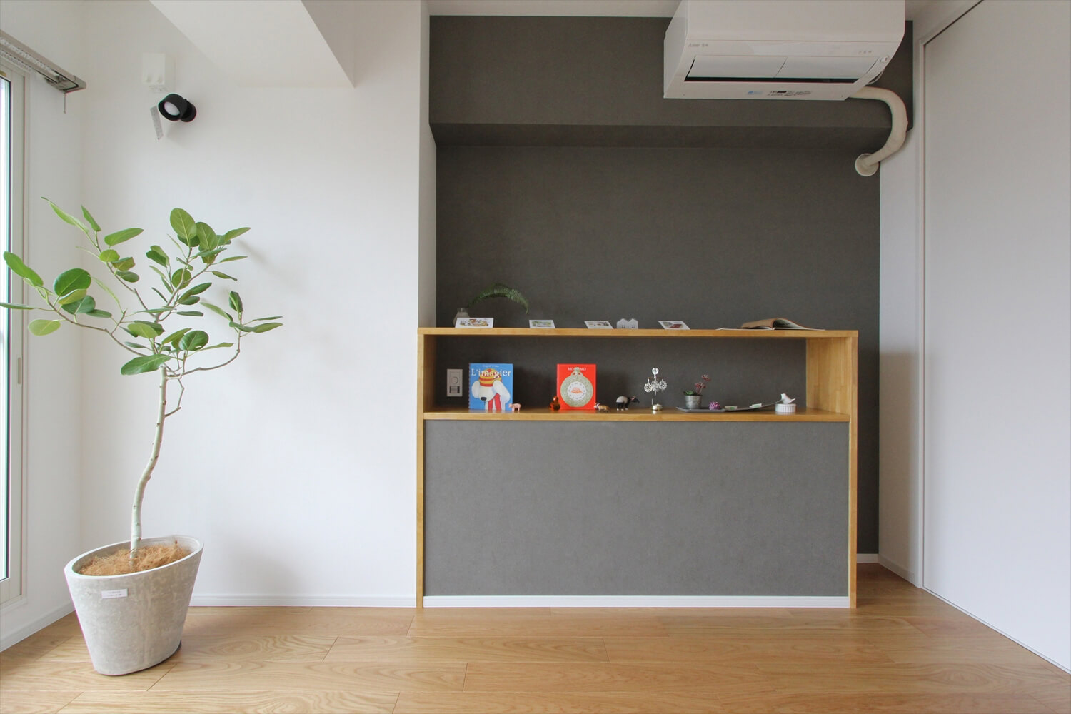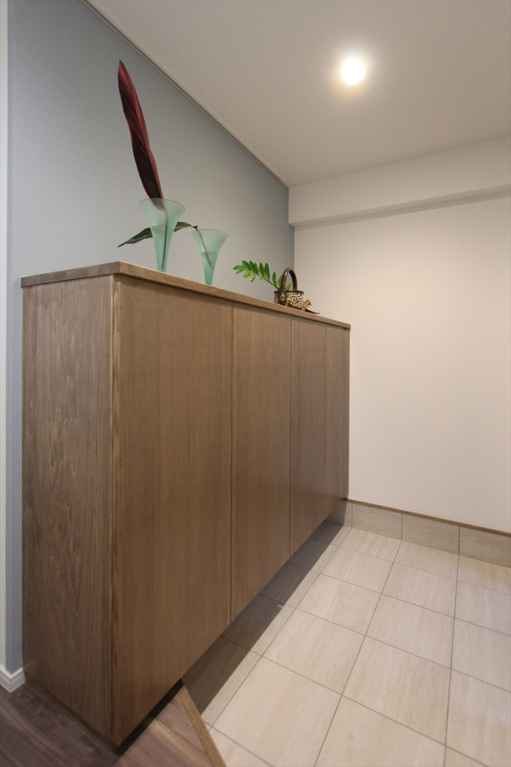 玄関の正面には高さを上げて、抜け感を演出したシューズクローゼットを造作。上部はオープンなディスプレイスペースとし、季節の小物をさり気なく飾ることができます。