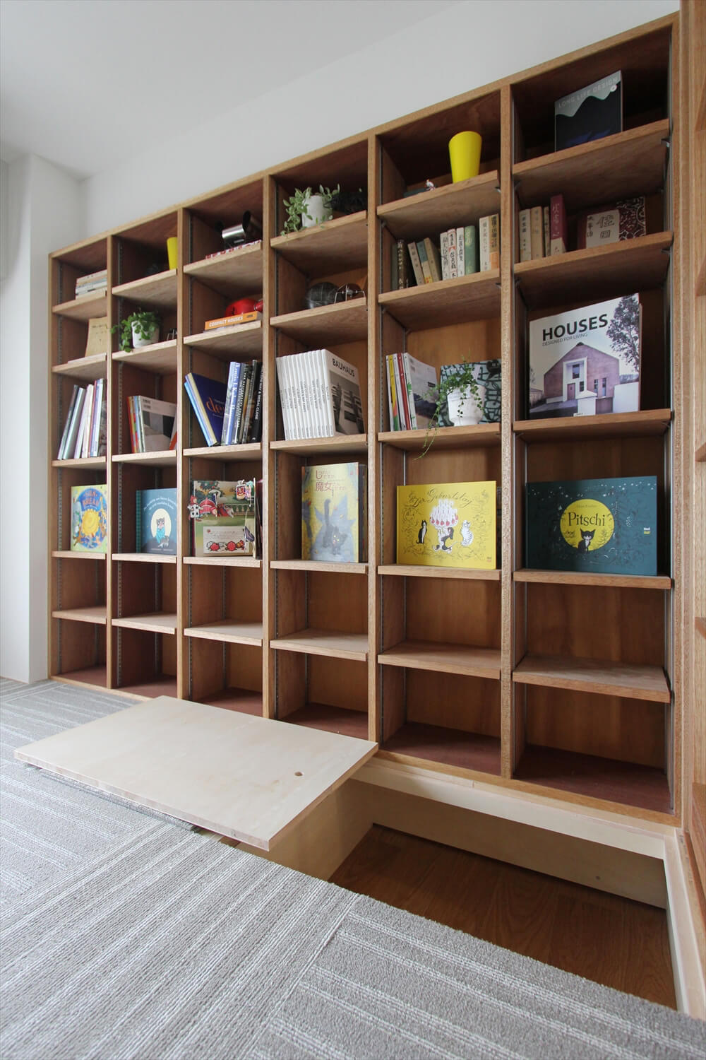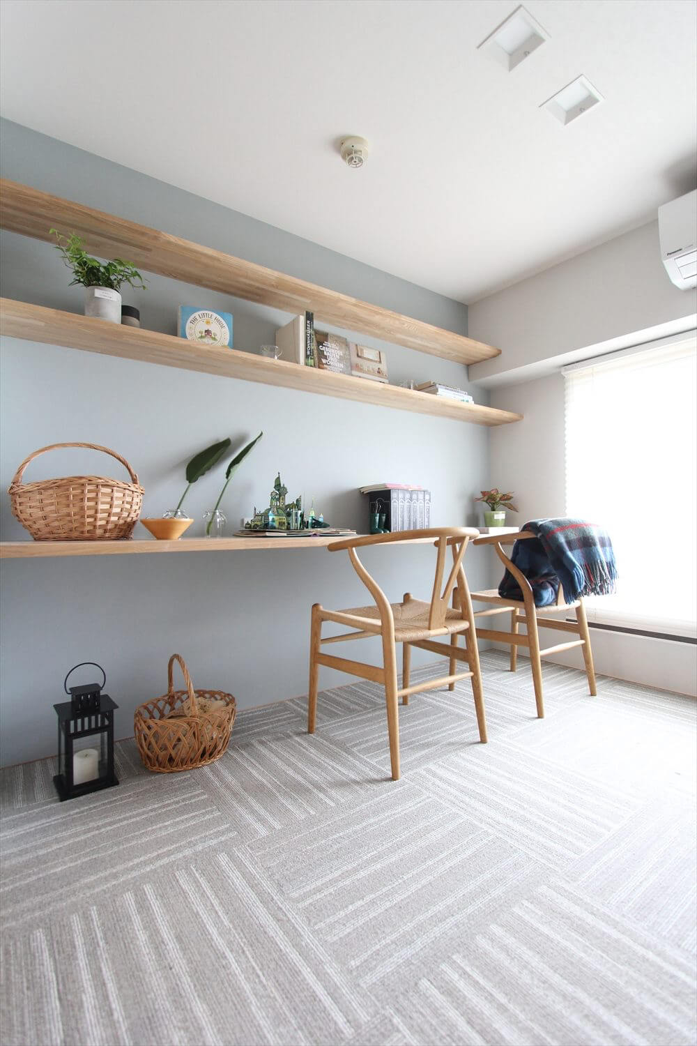 もともと畳だったスペースは、小上がりの書斎に。全体のトーンに合わせた優しいグレーのタイルカーペットにすることで、ちょっとモダンに。白をベースに、アクセントカラーのくすんだブルー&グレーの壁に、ガラス格子やタモの木目が印象的なブックシェルフなど、『北欧テイスト×和モダン』な書斎空間になりました。