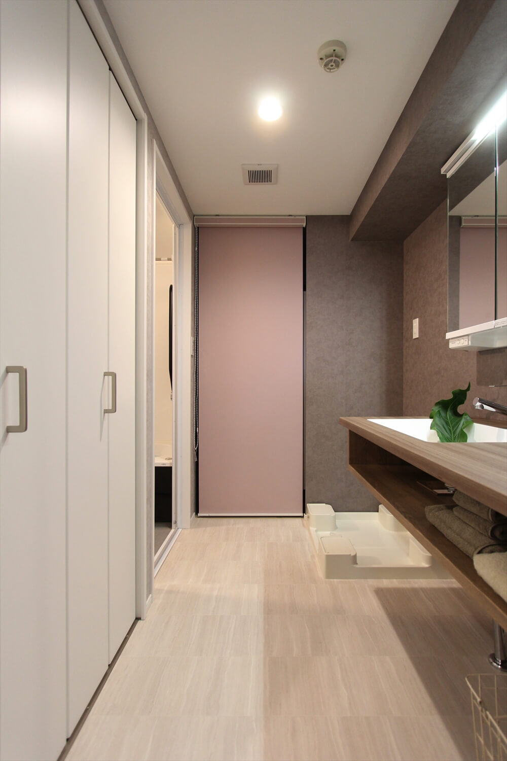 メタリックなラメ感のあるグレーの濃淡の壁に、高級感のあるダークな木目のカウンターが映える、ホテルライクな設えの洗面空間。洗面台の背面には、小物やタオル類を収納できるクローゼットを備えました。パイプスペースを隠すロールスクリーンは、2019年のミラノサローネでも人気のグレージュにピンクをアクセントに加えるカラーリングを意識した奥様セレクトです。
