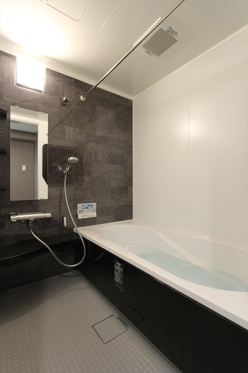 もともと1216サイズだったバスルームを1616へと拡大。その分、子ども部屋は圧縮されましたが、毎日使うリラックスタイムがより充実したものに。アクセントパネルは黒の石目調をチョイス。LIXILのなかでも不動の人気を誇るデザインパターンです。
