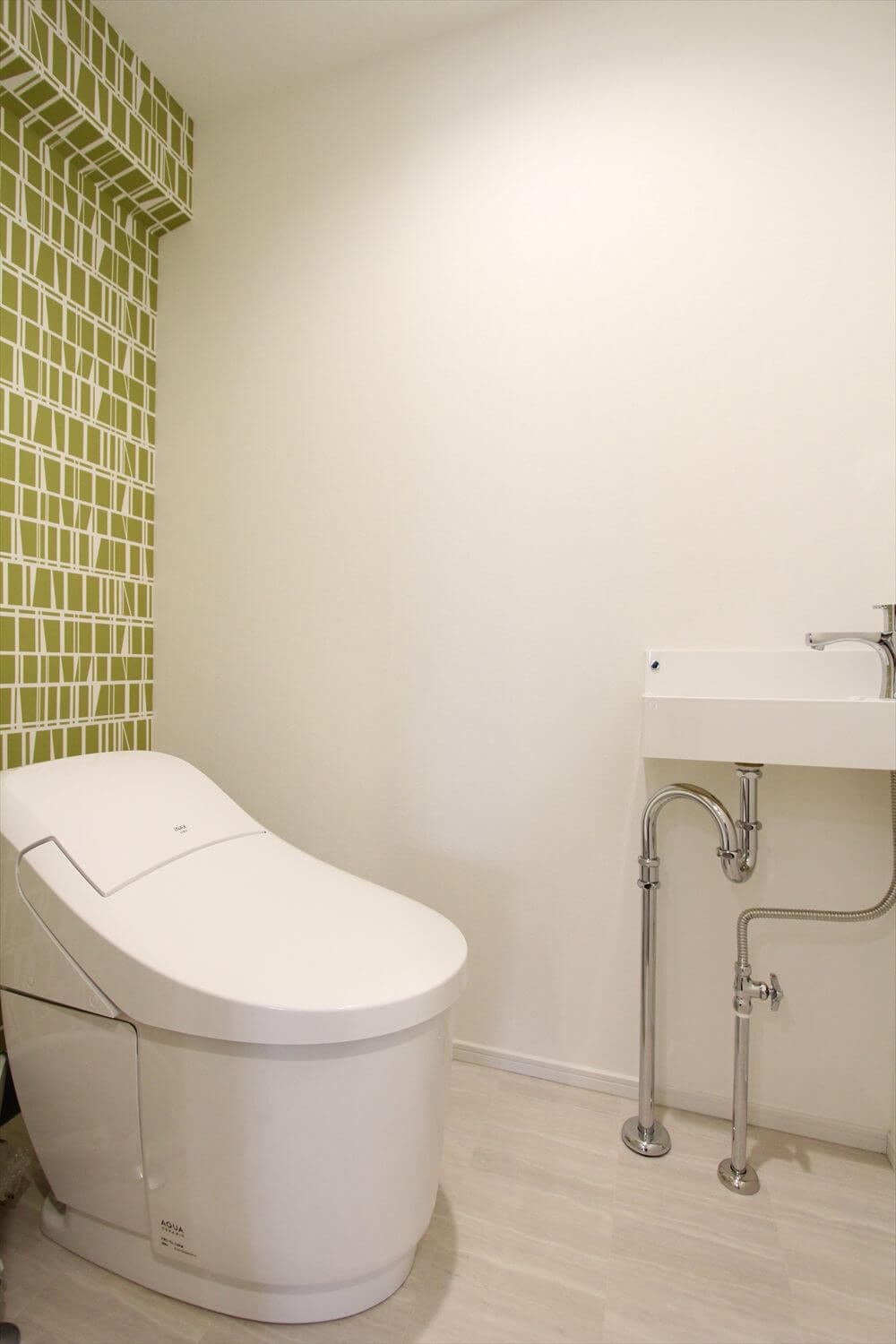 トイレはタンクレスタイプを採用したため、シンプルな手洗い器も備えました。北欧感のあるアクセントクロスを背面に。