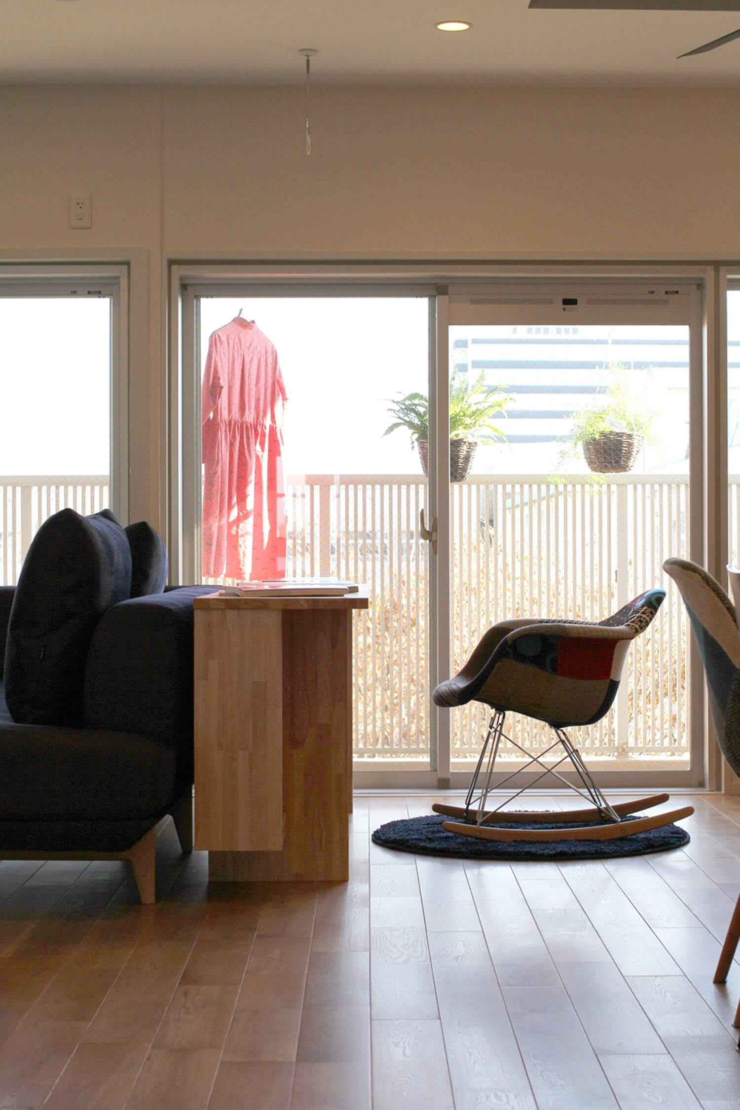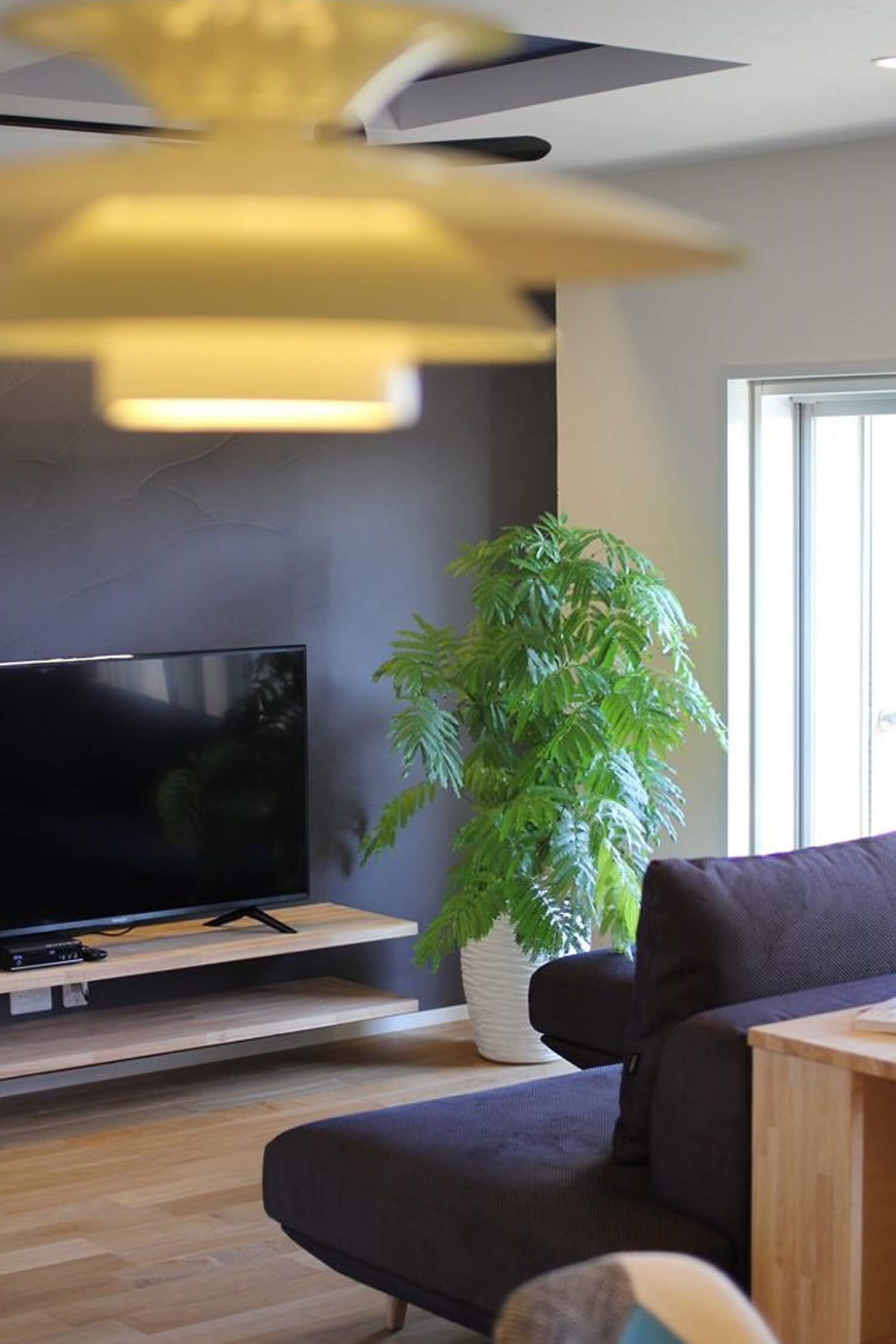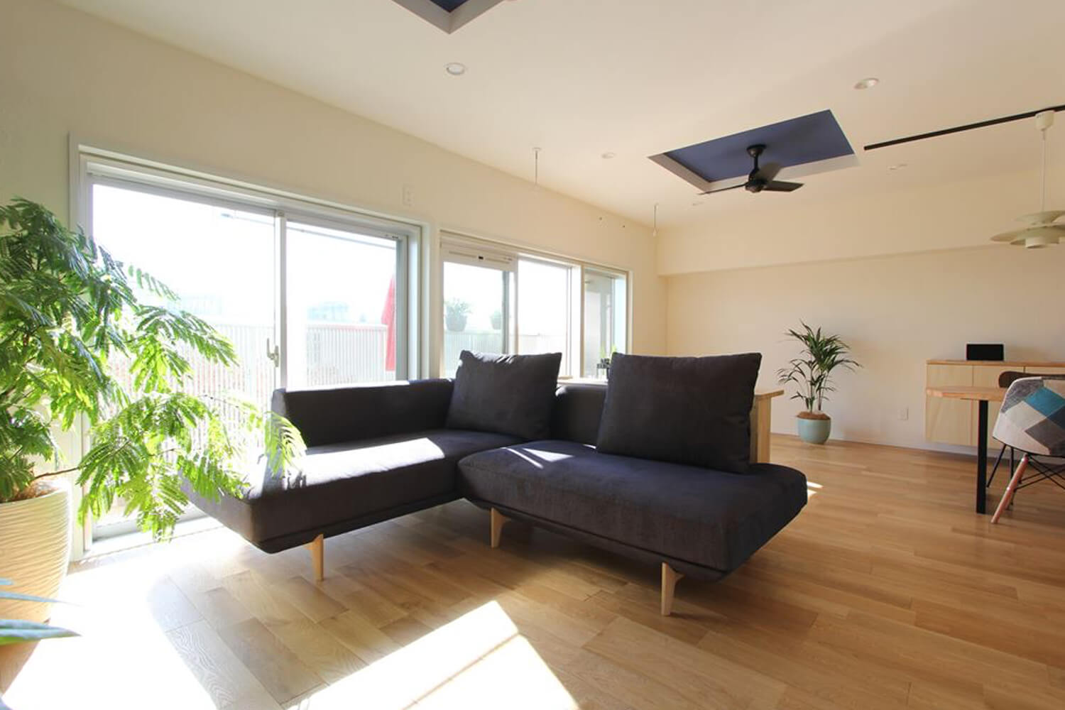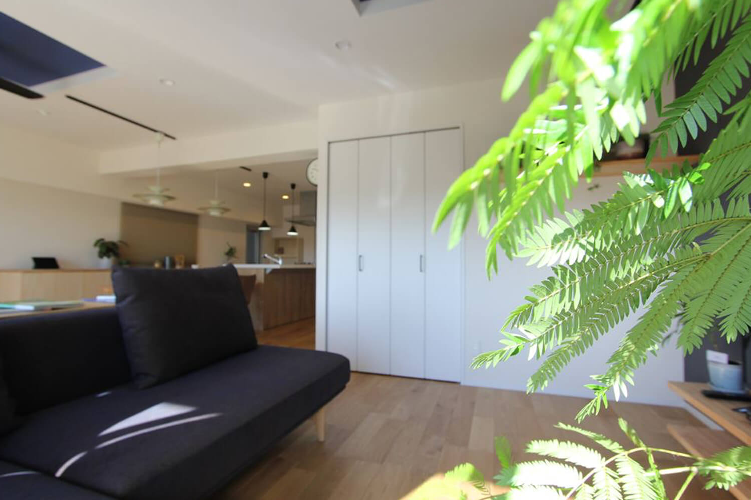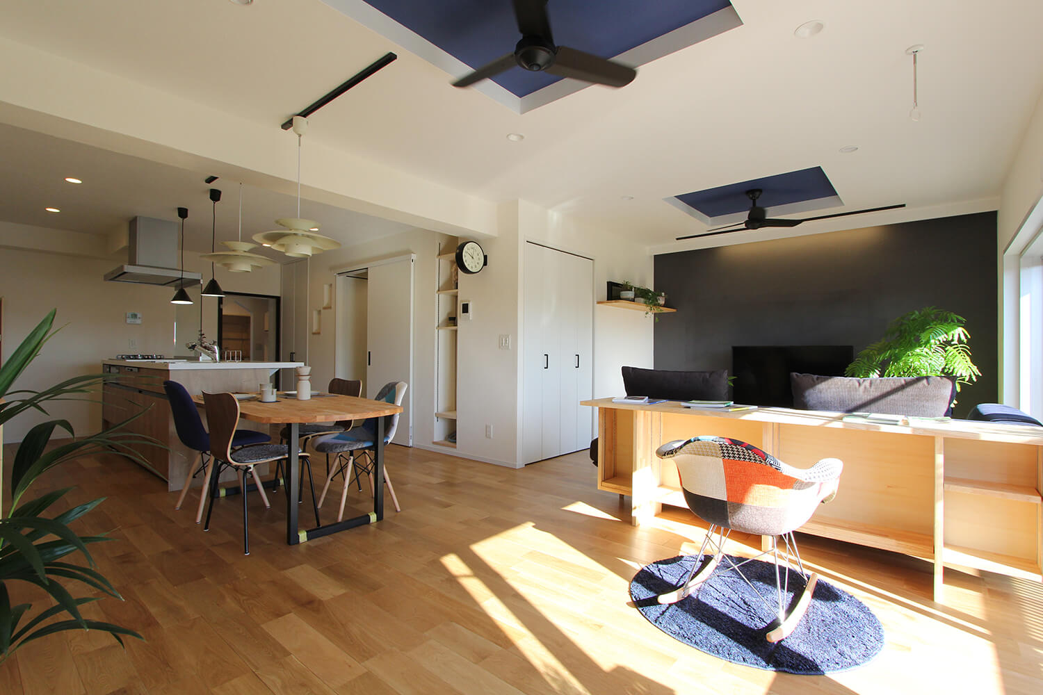 オーナーがさまざまな家具屋に足を運んで見つけたカリモク家具のソファを中心にリビングスペース。テレビボードの背面のみアクセントとして色を変えて仕上げました。エアコン効率の向上に寄与するシーリングファンを備えた天井は、一部を折り上げて仕上げることで、圧迫感が軽減されるように工夫しています。また、このリビングスペースは、将来、間仕切ることで子ども部屋に変化できるように設計しました。