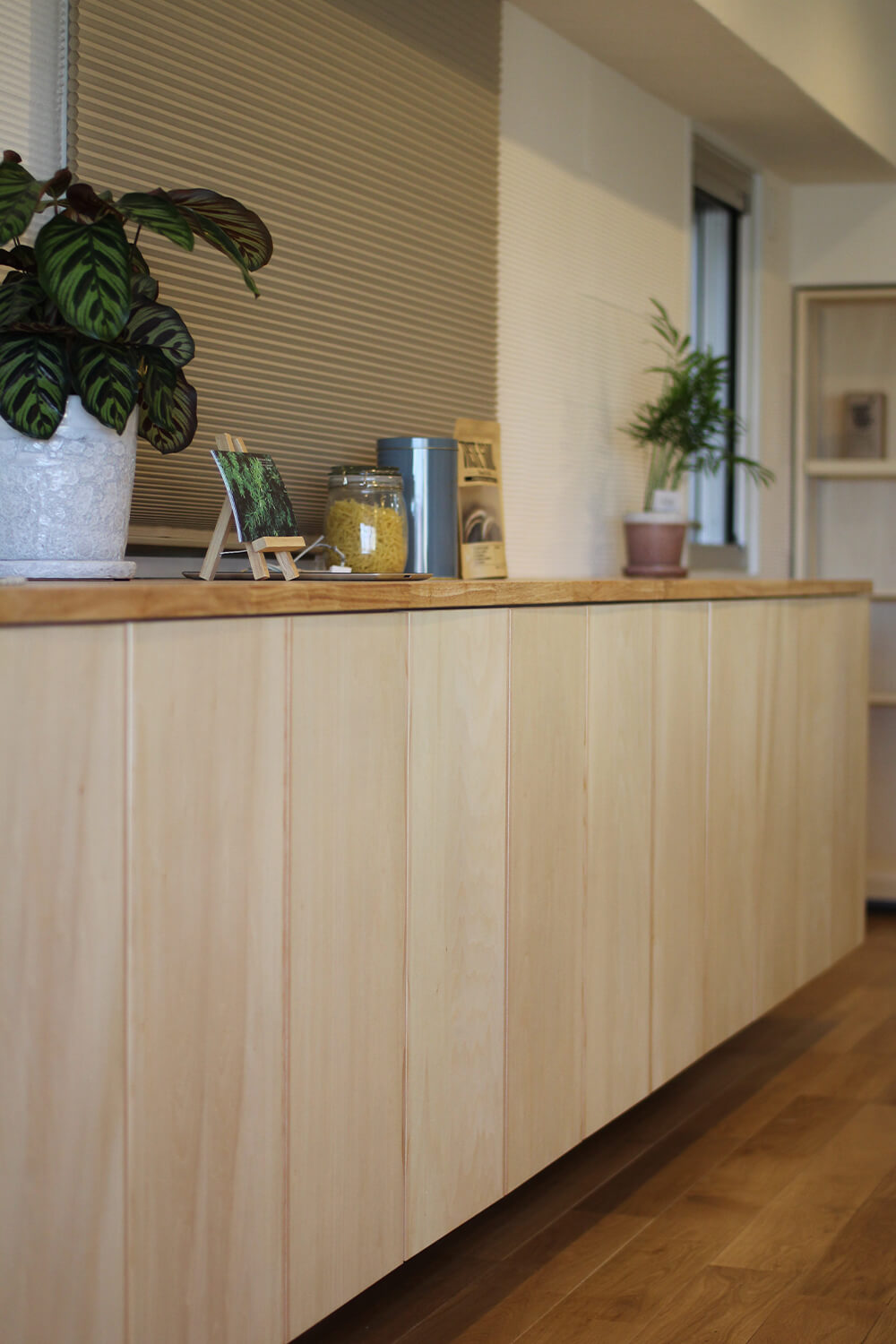 横幅およそ4mの壁付けカウンターは、調理家電等の置くためのスペースでありながら、カップボードとしての機能も併せ持った造作家具です。作業台としても活用できるよう、キッチン天板と同じ高さに揃えることで作業性はもちろん、見た目の統一感も向上しています。建具を備えたキャビネット部分は、収納したものが露出しないため、空間全体がスッキリとした印象に。収納の一部はダストボックスを収めることができるよう配慮しました。食器や食材ストック以外に、書類や日用品等を収めてもまだまだ余裕のある大容量が嬉しい設計です。床から10cmほど浮かせているのは、「開放的」にみせるための工夫です。