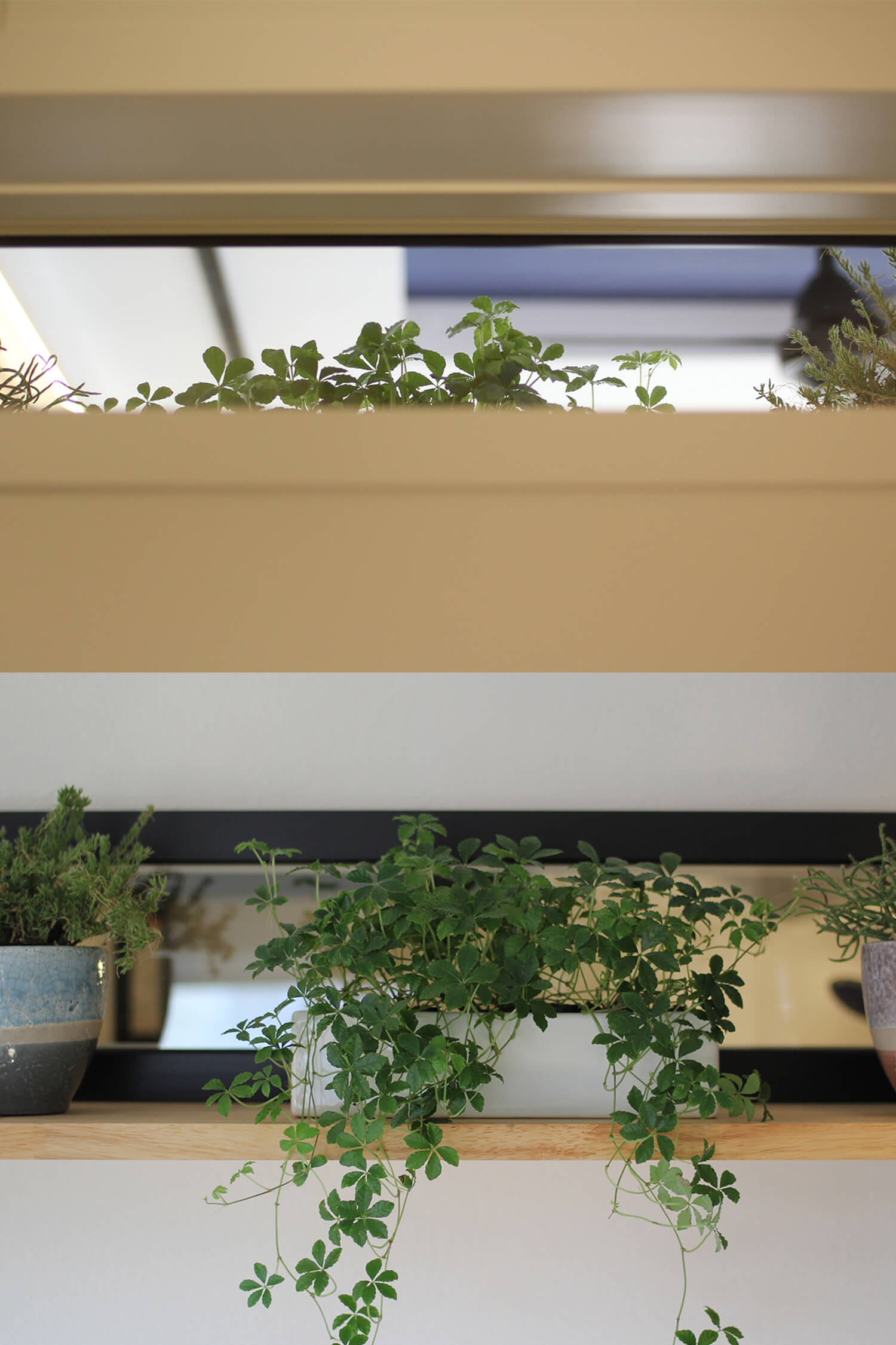 マンションのバスルームは窓がないケースも多く、明るさや爽やかさを諦めてしまいがち。その「諦め」を可能性に変えるために、ハイサイドに窓を設けるご提案をしました。そうすることで、暗くなりがちなバスルームに光が入り、爽やかな空間を演出。窓の反対側はリビングにあたるため、そちらには観葉植物を置ける小さな棚を設け、目隠しとしての機能も持たせています。結果的にバスルーム側、リビング側どちらからも植栽を眺めることができ、リラックス効果も期待できます。