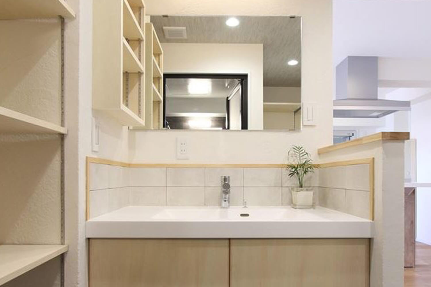 汚れに強い人造大理石でできた、洗面ボウル一体型のカウンターを使った造作洗面台。一体成型となっているため、継ぎ目や溝がなく、カビや水垢汚れの心配もありません。機能的な既成の洗面化粧台も素敵ですが、このようにお好きなボウルや水栓金具をチョイスし、お気に入りのタイルを貼って、鏡のカタチや大きさにこだわった造作の洗面台は、モノづくりの原点のような楽しさを味わうことができます。そこに新たな価値を見出せることも、家づくりの醍醐味の一つと言えるでしょう。