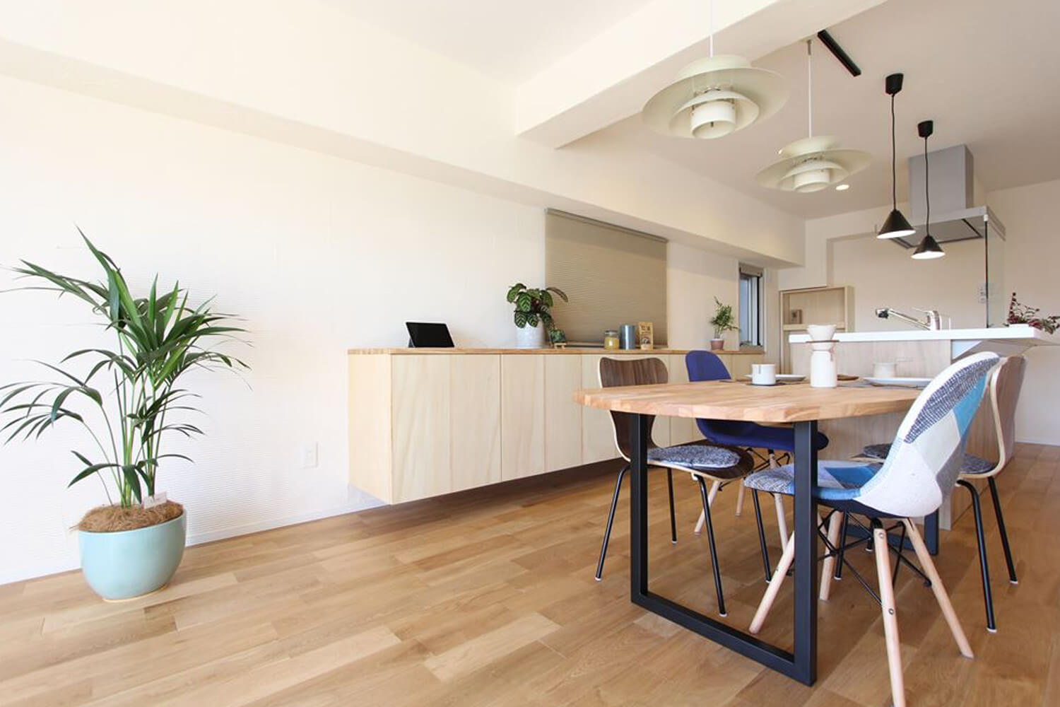 ご主人のご実家と同じマンションで物件探しをしていたご夫婦。この物件がもつ「風通しの良さ」を活かすため、間取りを3LDKから1LDK+WICへと大胆にリノベーション。築40年のマンションが、全室に光と風が舞い込む健康的な暮らしを叶える空間に生まれ変わりました。壁全体を漆喰、床はオークの無垢材で仕上げ、自然素材へのこだわりも叶えました。