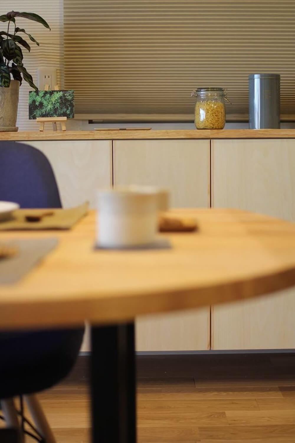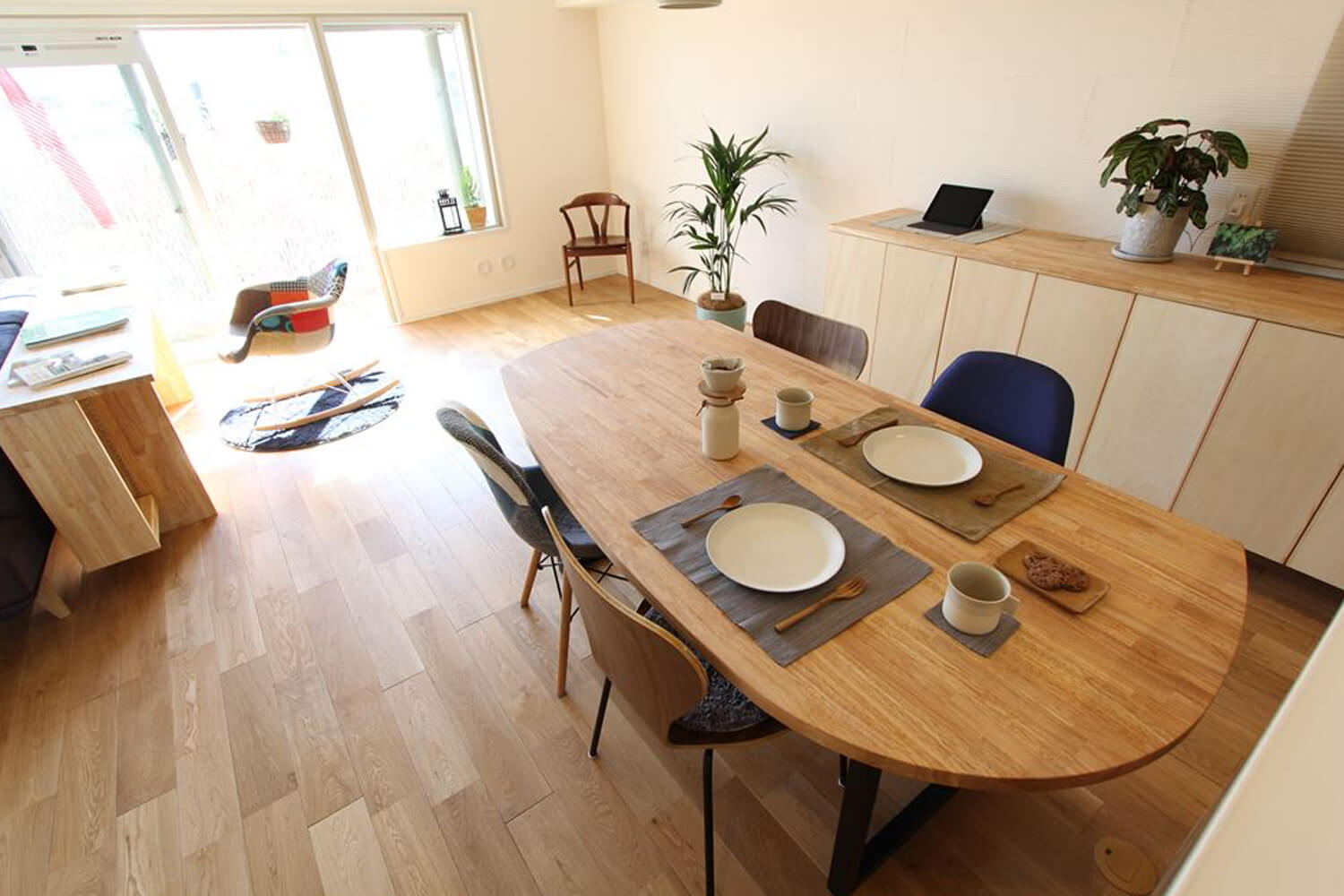 大勢のゲストとともに料理や食事を楽しめるよう、キッチンに接するかたちでダイニングテーブルを配置。ベランダから十分な採光も確保できるため、屋内にいながらにしてテラスにいるような明るい空間のなか、家族やゲストと存分に会話を楽しむことができます。楕円形のダイニングテーブルは、オーナーみずからそのカタチを考え、素材選びにもこだわったフルオーダー仕様。実寸の型紙をつくり、円形部(アール部分)の細部まで再現することで、イメージ通りの仕上がりとなりました。