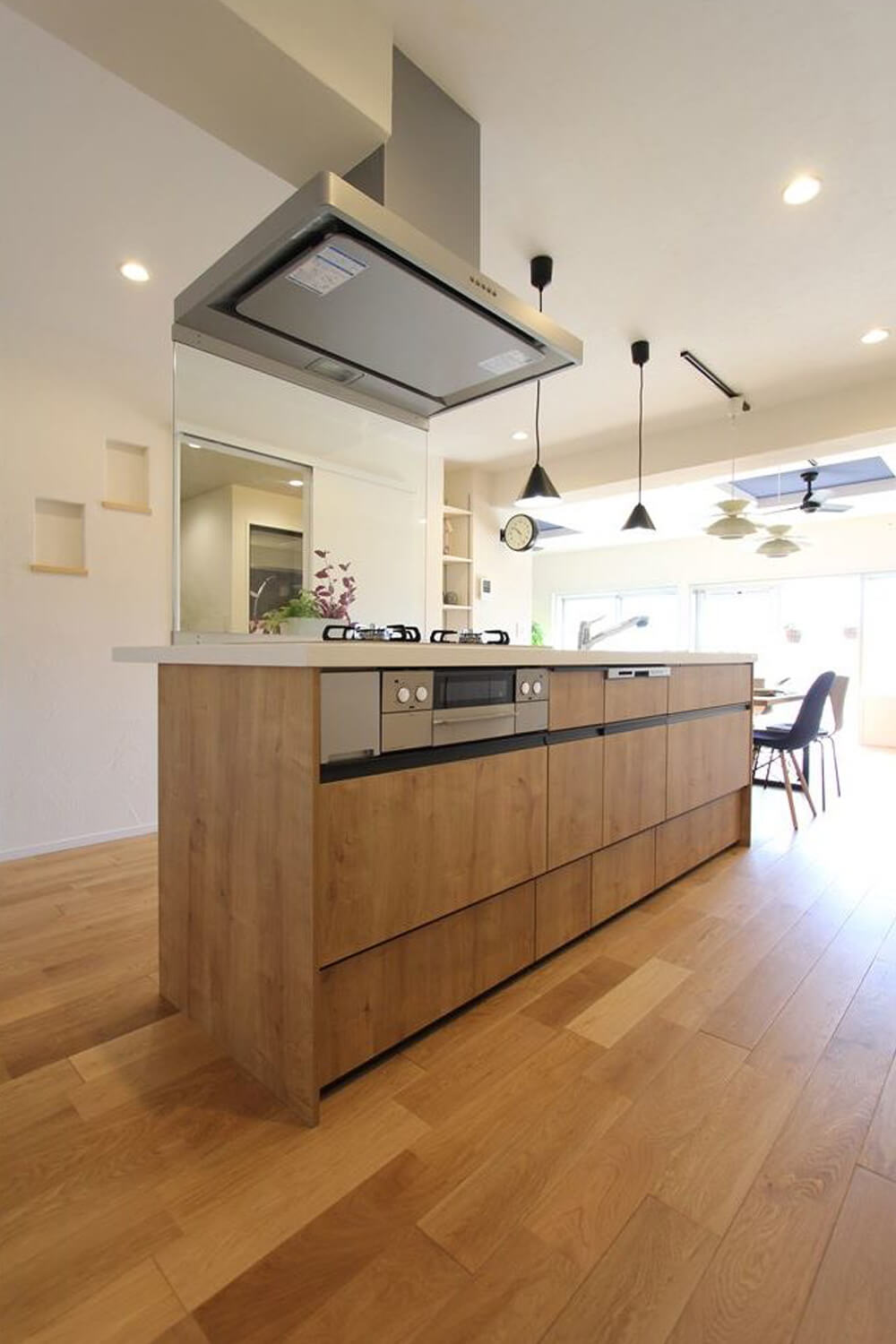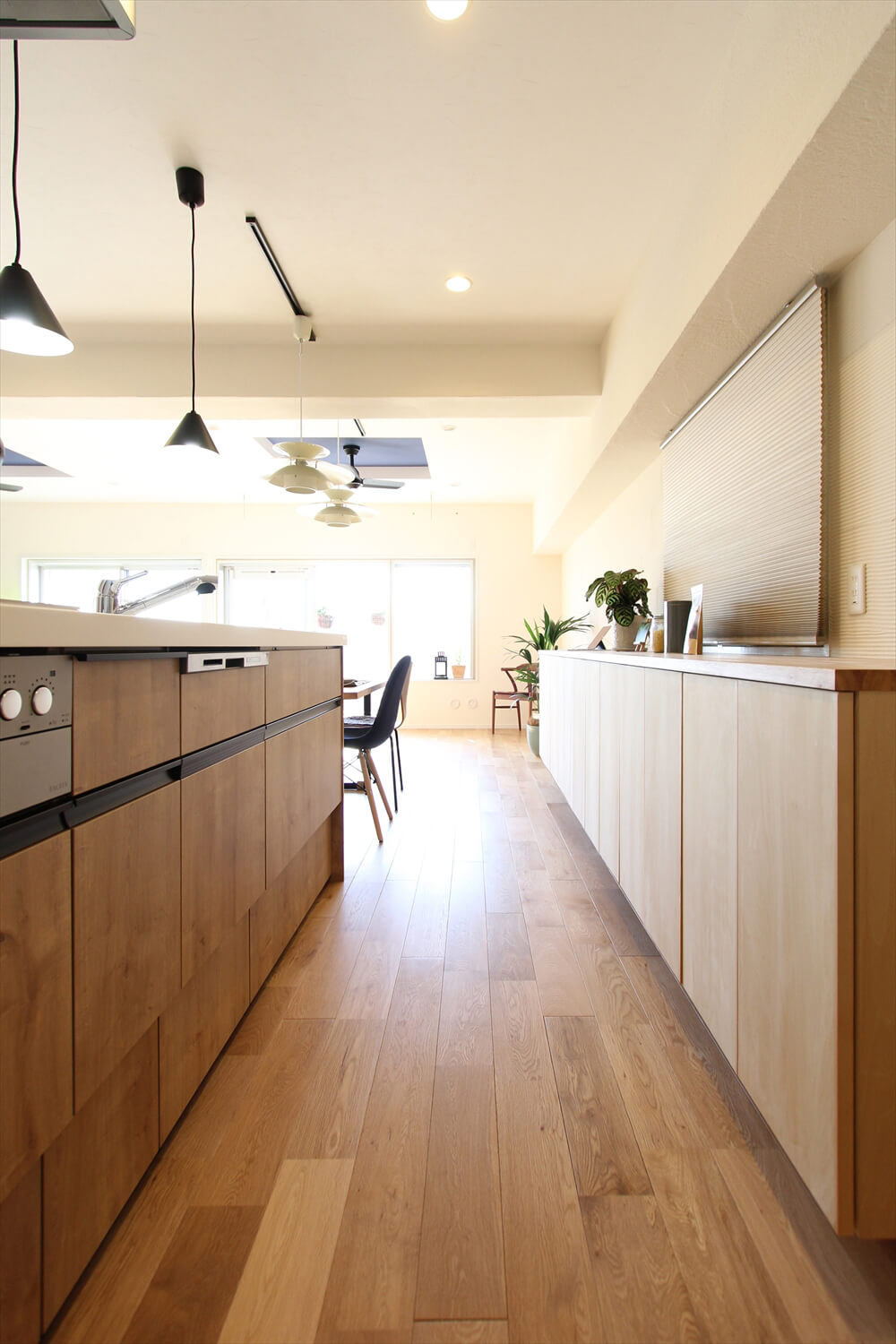 同じマンションに住むご両親や、近くにいるご友人、ご親戚と同じ時間を共有できる場として、キッチンを中心に回遊できるレイアウトに。キッチンは収納面でのメリットを重視してLIXILのアレスタを採用。床のオーク材に合わせた柄の面材をセレクトすることで、空間全体に統一感が生まれました。ゲストが多く訪れることを見越して、食洗器は深型をチョイス。浅型タイプでは対応できない大皿等をお使いの場合、深型がオススメです。