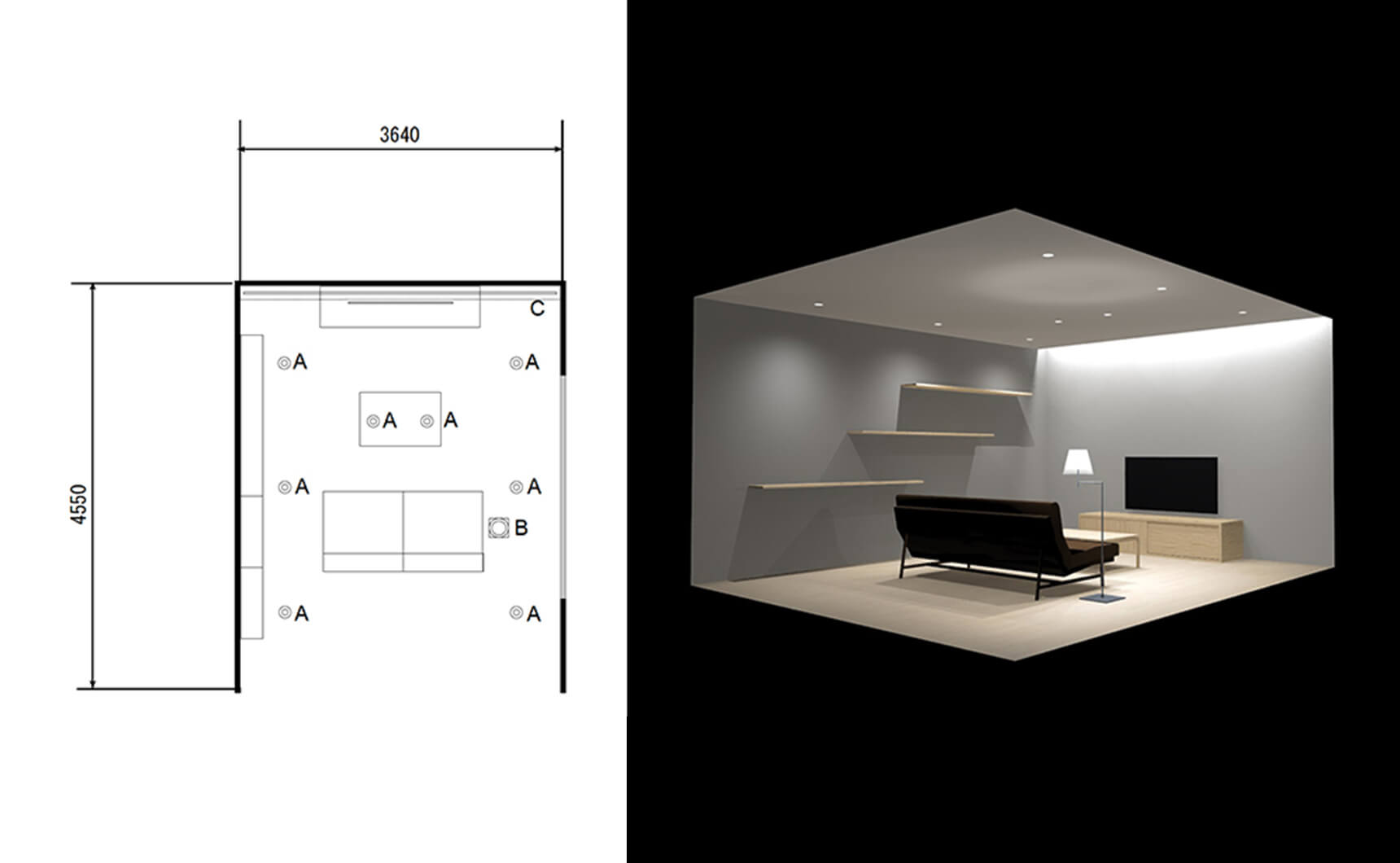 C : 間接照明で奥の壁を照らし、空間の奥行きを出します。また、テレビの背面を明るくすることで目の負担軽減へと繋がります。